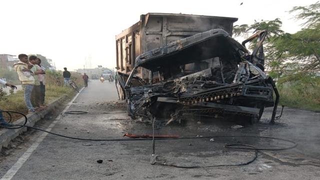 भदोही,उजाला सिटी। अवराई थाना क्षेत्र के उगापुर नहर के पास स्थित एक पेट्रोल पंप के पास शुक्रवार सुबह के समय दो डंपरों में जबरदस्त टक्कर हो गई। हादसे में एक डंपर में आग लग गई। जिससे उसका चालक केबिन में फंसकर जिंदा जल गया। पुलिस ने शव को कब्जे में लेकर पोस्टमार्टम के लिए भेज दिया और हादसे की जांच शुरू कर दी।