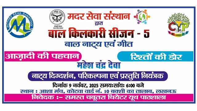 लखनऊ,उजाला सिटी। कल रविवार को मदर सेवा संस्थान द्वारा बाल किलकारी सीज़न- 5 का आयोजन आशा मंच, कोटवा वार्ड न. 10, बक्शी का तालाब, लखनऊ में शाम 6 बजे किया जायेगा l