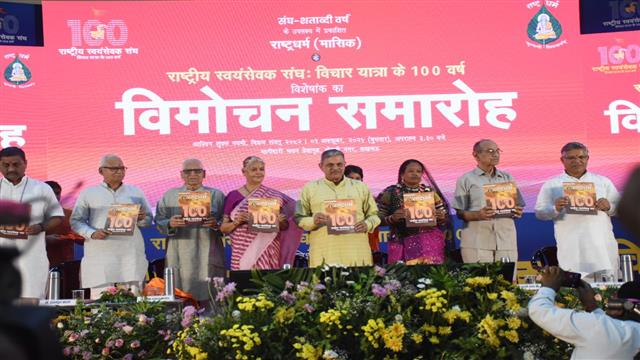 लखनऊ,उजाला सिटी। राष्ट्रीय स्वयंसेवक संघ की शताब्दी वर्षगांठ के अवसर पर 1 अक्टूबर, 2025 को राष्ट्रधर्म पत्रिका द्वारा भागीदारी भवन सभागार, गोमती नगर में एक भव्य कार्यक्रम का आयोजन में विशेषांक “ राष्ट्रीय स्वयंसेवक संघ : विचार यात्रा के 100 वर्ष” का विमोचन किया गया। इस विशेष अवसर पर विभिन्न क्षेत्रों से जुड़े प्रबुद्ध जन, साहित्यकार, समाजसेवी और विचारक उपस्थित रहे। कार्यक्रम के मुख्य अतिथि संघ के माननीय सरकार्यवाह श्री दत्तात्रेय होसबाले जी ने कहा कि, राष्ट्रधर्म एक शाश्वत धर्म है। भारत में जन्मे प्रत्येक व्यक्ति का यह कर्तव्य है कि वह सोचे- राष्ट्र के लिये जीवन में, किस क्षेत्र में हम क्या कर सकते हैं? राष्ट्रधर्म की शुरुआत संघ के स्वयंसेवकों ने समाज में वैचारिक परिवर्तन लाने के लिए की थी, न कि आर्थिक लाभ के लिए। 1948-49 के कठिन दौर से लेकर अब तक इस पत्रिका ने हिंदुत्व के विचार को समाज में पहुंचाने का कार्य किया। स्वयंसेवक का भाव होता है कि मैं हिन्दू, धर्म और संस्कृति की रक्षा करने के लिए समाज का घटक या अंग बना हूँ। मैं समाज से अलग नहीं हूँ और अगर समाज रूपी शरीर में किसी तरह का दर्द है, तो उसे अपना दर्द समझ करके मुझे दूर करना है। संगठन के कार्य को तन-मन-धन देकर जीवन भर करना है। उन्होंने कहा कि राष्ट्रधर्म के साथ देश में अन्य वैचारिक पत्रिकाओं ने भी विचार जागरण में महत्वपूर्ण भूमिका निभाई है। संघ का हर कार्य संघर्ष से भरा रहा है। कई कार्यकर्ताओं ने इस यात्रा में बलिदान दिया, अनेकानेक कठिनाइयाँ झेलीं, लेकिन कभी लक्ष्य से विचलित नहीं हुए। तन-मन-विचार सब समर्पित कर स्वयंसेवकों ने समाज को संगठित किया। यही संघ की असली पूंजी है। उन्होंने कहा कि दीनदयाल उपाध्याय, अटल बिहारी वाजपेयी ने भी राष्ट्रधर्म से जुड़कर इसे सशक्त किया। आर्थिक कठिनाइयों के बावजूद पत्रिका का प्रकाशन नहीं रुका क्योंकि इसके पीछे संकल्प था—समाज को विचार और दृष्टि देना। संघ को आज 100 साल पूरे हो गए हैं। समाज में परिवर्तन लाने के लिए समाज में जो भी अच्छा कार्य हो रहे हैं उन सबको जोड़ेंगे। समाज में पुनर्निमाण व नवनिर्माण के कार्य होते रहेंगे। इनका केवल समर्थन नहीं करना है, स्वयं इस कार्य से जोड़ना है। यही संघ की अभिलाषा है। राष्ट्रीय स्वयंसेवक संघ नाम का एक महाअभियान अपने 101वें वर्ष में प्रवेश कर रहा है। यह साधना 100 वर्षों से चली आ रही है। उसी साधना का एक आयाम लखनऊ से राष्ट्रधर्म पत्रिका के रूप में प्रकाशित हो रहा है। 78 वर्ष पूर्व संघ के स्वयंसेवकों ने इसकी शुरुआत की थी। सरकार्यवाह जी ने कहा कि आज जब दुनिया भारत को विश्वगुरु कह रही है, तब यह जिम्मेदारी और अधिक बढ़ जाती है कि वह अपने अध्यात्म, संस्कृति और मूल्यों के बल पर विश्