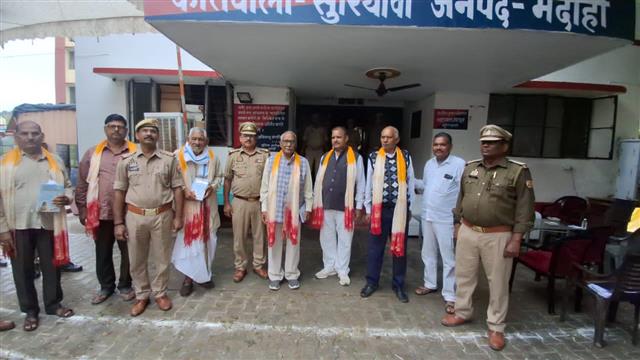 भदोही,उजाला सिटी। जनपद भदोही के थाना सुरियावा में आज दिनांक 31 अक्टूबर 2025 को एकता दिवस के अवसर पर अमर दत्त मिश्रा पूर्व पुलिस महानिरीक्षक इलाहाबाद जोन इलाहाबाद (सेवानिवृत्ति)अन्य पुलिस के सेवानिवृत क्षेत्राधिकारी,इंस्पेक्टर सब इंस्पेक्टर एवं मुख्य एवं आरक्षी जिन्हें सादर आमंत्रित किया गया था महोदय द्वारा ही एकता दिवस का शपथ ग्रहण सभी कर्मियों को कराया गया तत्पश्चात आगंतुक रिटायर्ड कर्मियों को सम्मानित किया गया अंग वस्त्र एवं यथार्थ गीता देकर सूक्ष्म जलपान के साथ उनकी कुशलता प्राप्त कर उन्हें स्वस्थ की शुभकामना की गई तथा उनके साथ कम्युनिकेशन बनाने का आश्वासन भी दिया गया उक्त रिटायर्ड अधिकारियों कर्मचारियों द्वारा थाना सुरियावा की इस सांस्कृतिक कार्यक्रम की भूरि भूरि प्रशंसा की गई